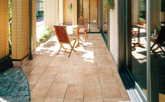 玄関には定番の御影石調タイル、ポーチにはテラコッタ調タイルで南欧風の雰囲気を演出できます。