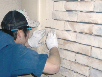 モルタルを練り水平器で確認しながら一枚一枚丁寧に貼っていく。