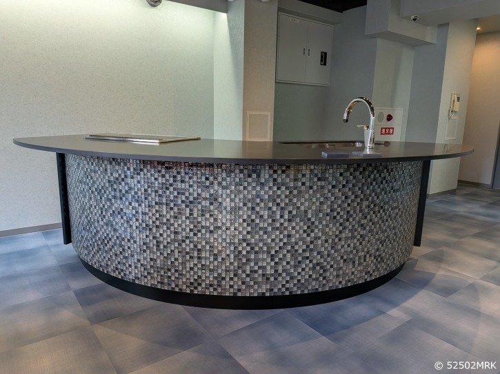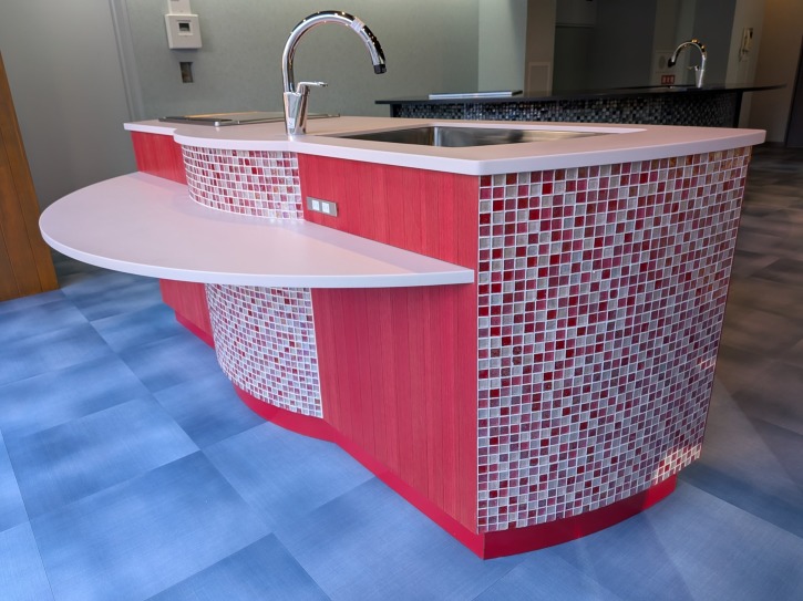 アトリエブルックス 小川 博久様が アイランドキッチンの意匠登録出願され昨年末 神戸市中央区下山手通3-10-10 カーサ神戸下山手1階に 昨年末ショールームをオープンされました。 弊社はオーダー家具製作の会社です。が ご縁があり新規製作に携わり カウンター4台の製作をしました。 お客様のこだわりで色々とカウンター腰の材料を探されている中 ガラスタイルと出会い決められました。