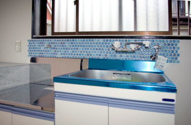 ワンルームアパートのキッチンを、タイルを貼ってきれいに改装しました。 入居者は他にない綺麗で清潔なタイル張りだということで 直ぐに決まりました。