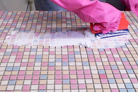 ゴムのついたコテなどで、目地材を塗り広げながらタイルの目地の溝に詰めていきます。