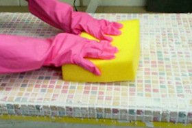 スポンジなどで、タイル表面に残った目地材をふき取ります。