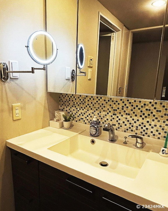 洗面台のミラー下をモザイクタイルでポップに演出した事例です。