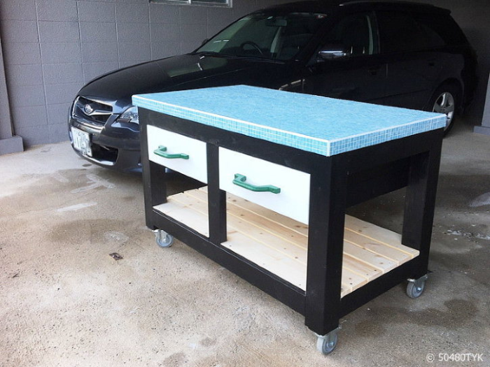 天板に青系のモザイクタイルを使ったピザテーブルです。アウトドアでピザをこねるためのテーブルとして作りました。DIYをはじめとした作業台としても役立ちます。