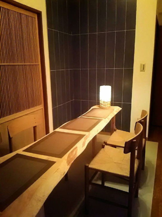 色数を抑えているので、飲食スペースでも落ち着いて過ごせるのがポイントです。木製建具との相性もよく、和室まわりのアクセントにも使いやすい貼り方です。
