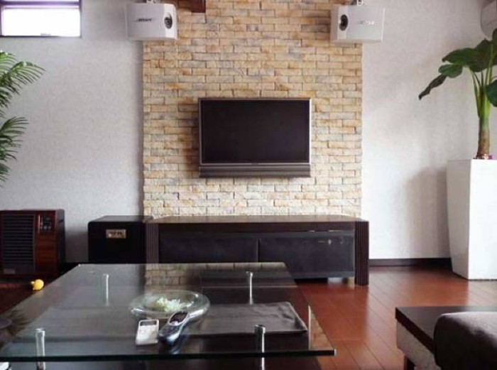 リビングのテレビ背面を、ベージュ・クリーム系の石調タイルで全面的に仕上げました。凹凸のあるタイルが光を受けて陰影をつくるため、同じ白壁でも厳かさを感じさせ、奥行きが出ます。