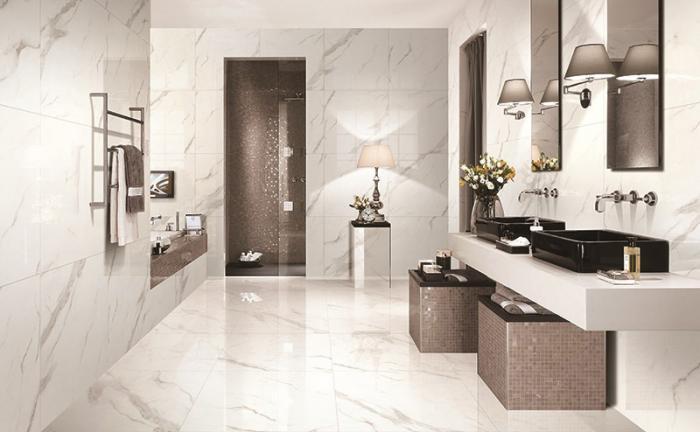 この天然のバラつきが気になったり、均一なデザインを好んだりする方には、セラミックタイルもおすすめです。セラミックタイルは、現代の技術で大理石の模様を忠実に再現したものであり、光沢も落ちにくい特徴があります。