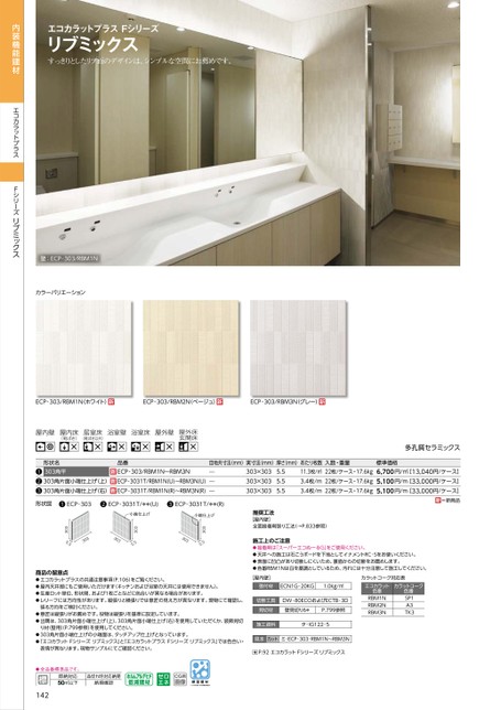 多孔質セラミックス標準価格6,700円/㎡[13,040円/ケース]5,100円/m[33,000円/ケース]5,100円/m[33,000円/ケース]=新商品推奨工法[屋内壁]全面接着剤張り工法(→P.833参照)施工上のご注意●接着剤は「スーパーエコぬーるG」をご使用ください。●天井への施工は石こうボードを下地としてイナメントRC‐Sをお使いください。●表面に凹凸があり切断しにくいため、裏面からの切断をお薦めします。●色番RBM1Nは白を基調としているため、汚れには十分注意して施工してください。カラットコーク対応表エコカラット色番RBM1NRBM2NRBM3Nカラットコーク色番SP1A3TK3[屋内壁]張付材ECN1G‐20KG1.0kg/㎡切断工具DW‐80ECOおよびECTB‐3D見切材壁見切り6*P.799参照施工資料タ‐IG122‐5見本カットミ‐ECP‐303‐RBM1N〜RBM3NP.92エコカラットFシリーズリブミックスエコカラットプラスFシリーズリブミックスすっきりとしたリブ面のデザインは、シンプルな空間にお薦めです。壁:ECP‐303/RBM1NカラーバリエーションECP‐303/RBM1N(ホワイト)ECP‐303/RBM2N(ベージュ)ECP‐303/RBM3N(グレー)内装機能建材エコカラットプラスFシリーズリブミックス屋内壁屋内床(靴ばき)居室床(靴ばき以外)浴室壁浴室床屋外壁屋外床玄関床形状名303角平303角片面小端仕上げ(上)303角片面小端仕上げ(右)品番ECP‐303/RBM1N〜RBM3NECP‐3031T/RBM1N(U)〜RBM3N(U)ECP‐3031T/RBM1N(R)〜RBM3N(R)目地共寸法(mm)実寸法(mm)厚さ(mm)あたり枚数入数・重量̶̶̶303×303303×303303×30311.3枚/㎡3.4枚/m3.4枚/m22枚/ケース・17.6kg22枚/ケース・17.6kg22枚/ケース・17.6kg5.55.55.5形状図ECP‐303ECP‐3031T/**(U)ECP‐3031T/**(R)小端仕上げ小端仕上げ3035.53033035.53033035.5303商品の留意点●エコカラットプラスの共通注意事項(P.106)をご覧ください。●屋内天井部にもご使用いただけます(キッチンおよび浴室の天井には使用できません)。●生産ロット単位、形状間、および1枚ごとなどに色合いが異なる場合があります。●レリーフには方向性があります。縦張りと横張りでは意匠の見え方が異なります。現物にて確認し、張る方向をご検討ください。●意匠は縦張りがお薦めです。役物は縦張りを基準に設定しています。●出隅は、303角片面小端仕上げ(上)、303角片面小端仕上げ(右)を使用していただくか、装飾見切り材(壁用)(P.799参照)を使用してください。●303角片面小端仕上げの小端面は、タッチアップ仕上げとなっています。●「エコカラットFシリーズリブミックス」と「エコカラットプラスFシリーズリブミックス」では色合い・表情が異なります。現物サンプルにてご確認ください。●全品番標準品です。即納対応50㎡以下品切れ時対応納期納期確認142