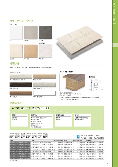 リフォーム向けタイル・工法201■断面図24125.513(5.5)実寸法:L=2000mm材質本体:ABS樹脂+ハイパーフィルムベース材:ABS樹脂※表面シートは天然木生地塗装の風合いを表現するために色柄をバラつかせており、1本ごとまたは1本内で色柄が異なります。床暖房対応あり=Yなし=Nタイル6種類のタイルの中からお選びください。M1:イタリアンウォルナットM2:メープルM3:ショコラオークM4:ホワイトオークM5:チェリー品番の見方M0:見切りなしATSF-01SET-M1-Y/FS-21面積01=1㎡02=2㎡屋内壁屋内床(靴ばき)居室床(靴ばき以外)見切り材M1=イタリアンウォルナットM2=メープルM3=ショコラオークM4=ホワイトオークM5=チェリーM0=見切り材なし浴室壁浴室床屋外壁屋外床玄関床形状名2㎡セット(4シート)標準仕様(見切り材なし)2㎡セット(4シート)標準仕様(見切り材あり)2㎡セット(4シート)床暖対応(見切り材なし)2㎡セット(4シート)床暖対応(見切り材あり)1㎡セット(2シート)標準仕様(見切り材なし)1㎡セット(2シート)標準仕様(見切り材あり)1㎡セット(2シート)床暖対応(見切り材なし)1㎡セット(2シート)床暖対応(見切り材あり)□…M1〜M5品番ATSF‐02SET‐M0‐N/FS‐21…WB‐22ATSF‐02SET‐□‐N/FS‐21…WB‐22ATSF‐02SET‐M0‐Y/FS‐21…WB‐22ATSF‐02SET‐□‐Y/FS‐21…WB‐22ATSF‐01SET‐M0‐N/FS‐21…WB‐22ATSF‐01SET‐□‐N/FS‐21…WB‐22ATSF‐01SET‐M0‐Y/FS‐21…WB‐22ATSF‐01SET‐□‐Y/FS‐21…WB‐22あたり枚数目地共寸法(mm)実寸法(mm)厚さ(mm)̶̶̶̶̶̶̶̶895×595895×595895×595895×595895×595895×595895×595895×5959.0(タイルシート)̶9.0(タイルシート)̶9.0(タイルシート)̶9.0(タイルシート)̶9.0(タイルシート)̶9.0(タイルシート)̶9.0(タイルシート)̶9.0(タイルシート)̶タイル:BⅠ[磁器質]|施釉タイルシート目地:ウレタン系樹脂入数重量̶̶̶̶̶̶̶̶48kg/セット48kg/セット48kg/セット48kg/セット25kg/セット25kg/セット25kg/セット25kg/セット標準価格70,000円/セット[̶円/ケース]82,000円/セット[̶円/ケース]72,000円/セット[̶円/ケース]84,000円/セット[̶円/ケース]40,000円/セット[̶円/ケース]48,000円/セット[̶円/ケース]41,500円/セット[̶円/ケース]49,500円/セット[̶円/ケース]カラーバリエーション〈プレーン調〉FS‐21FS‐22FS‐24〈大理石調〉FSL‐21FSL‐23WB‐22見切り材周囲のフローリングとコーディネートできる見切りを用意しました。カラーバリエーション見切り材の仕様