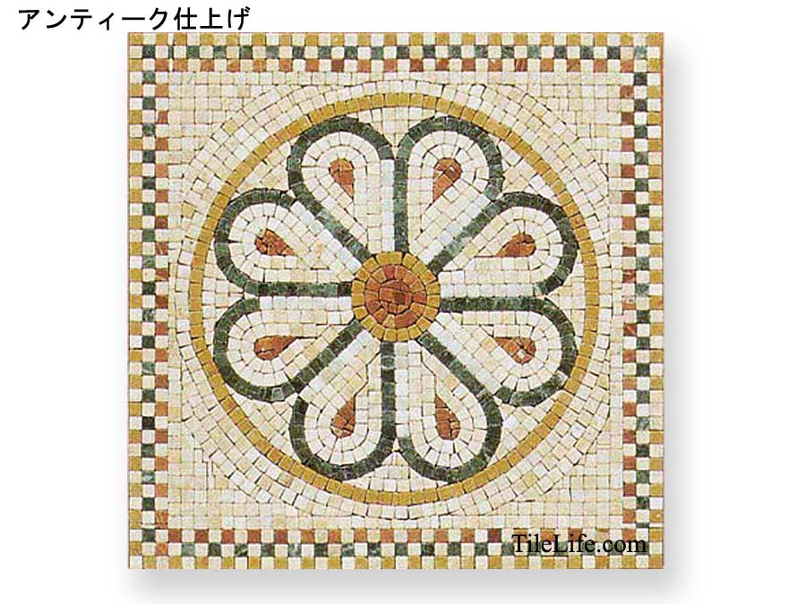 大理石のモザイクパターン アンテイーク仕上げ ホテルの大浴場の床に使用されています。 [製造国:中国][出荷元:関東エリア] ■表面:ツヤ無し(エッジは丸みを帯びています) ■面状:フラット ■手触り感:少しザラザラ ■シート目地共寸法:600×600mm(ケース:1シート(枚)入り) (正面写真が1シートでパターンがセットされた状態で出荷) ■裏面ネット貼り ■基本の大理石チップの大きさは10〜15mm程度となります。 ■使用石種:ジアロロイヤル・グリーンジェイド・ミングリーン ・チャイナベージュ・ロッソアリカンテ <注意点> ・天然石の切石のため、寸法誤差、若干の欠け及び色や模様にバラツキがございます。 ・裏ネットとモザイクがはずれ易いものがございますので、丁寧にお取り扱い願います。 ※この商品は、出品企業の都合でサンプルをご用意しておりません。