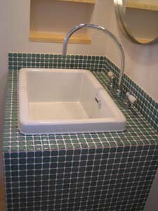 エメラルド色のモザイクが爽やかな洗面化粧台