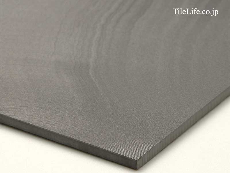 陶磁器の深み、金属質の美しい光沢感、まるでクシ目をひいたような洗練されたデザインが融合した750角の大判床タイル。