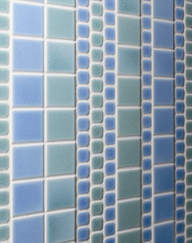 釉薬だまりに出来た貫入の繊細な質感をフレンチタイルを思わせるクリアーな発色の上釉の中に表現したモザイクタイル。