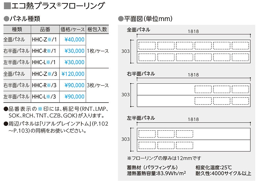 ・商品シリーズ名 : エコ熱プラス ・色名 : グレージュオーク柄 ・タイプ : 前面パネル ・品番 : HHC-ZGOK/1 国内初となる蓄熱機能を持つ木質フローリングと、業界トップレベルの高出力な放熱パネルを組み合わせ、再生可能エネルギーも利用できる住宅の新しい冷暖房システムです。 <注意事項> ●商品特性をご了解の上ご使用ください。 ※数量が多い場合は分納になる場合がございます。