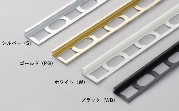 ●色番のSはシルバー、PGはゴールド、Wはホワイト、MBはブラックを、また壁見切りJ、C、R、Lの数字の6から13は適合タイル厚さを、壁見切りUの数字の15、25は見切り材の幅を示しています。