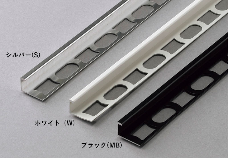 ●色番のSはシルバー、PGはゴールド、Wはホワイト、MBはブラックを、また壁見切りJ、C、R、Lの数字の6から13は適合タイル厚さを、壁見切りUの数字の15、25は見切り材の幅を示しています。