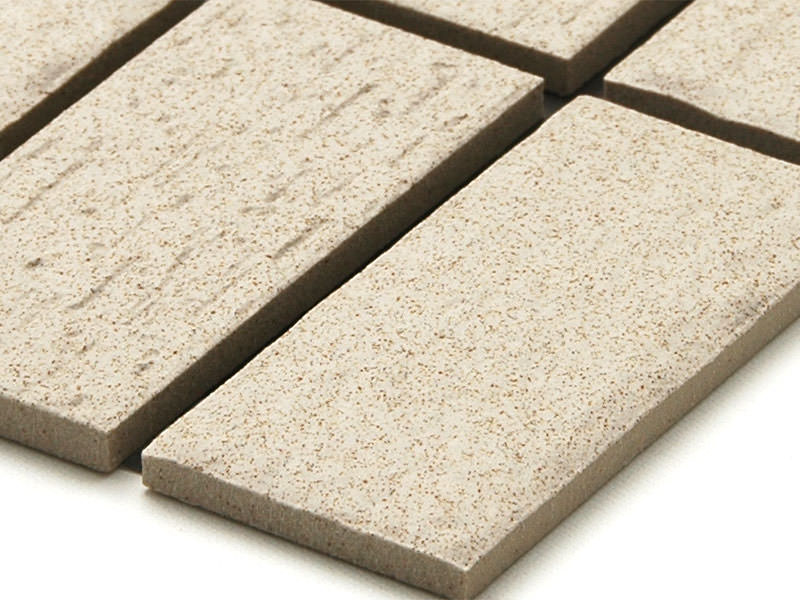 タイルライフのトップ > 外装モザイクタイル 50?二丁(45二丁)平 表面紙張り 立体面とヒッカキ面ミックス スダレ貼り ライトベージュ系 52440AWC