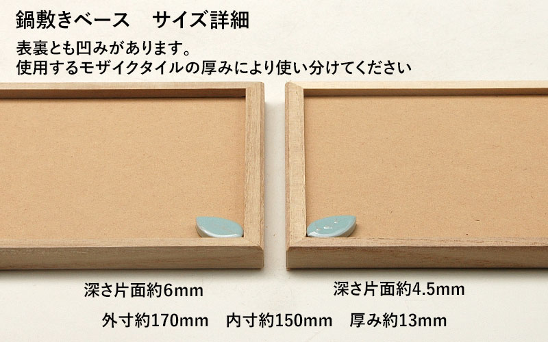 <タイル> 長方形:15mm×47.5mm、厚み6mm 19mm丸:19mm丸、厚み6mm リーフ:(中)約40mm×25mm、厚み7mm、(小)約30mm×18mm、厚み7mm <木製ベース> 外寸約170mm 内寸約150mm 厚み約13mm 深さ片面約4.5mm 片面約6mm |