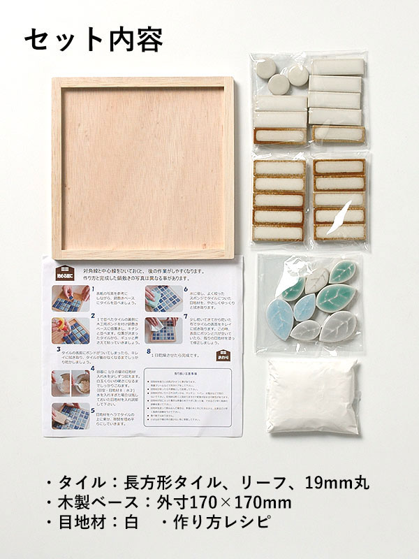<詳細> ●セット内容:美濃焼タイル(見本写真と同じ)、目地材100g、木製ベース1枚、作り方レシピ ※見本写真と同じ鍋敷きを1枚作ることができるキットです。 (自由にデザインをアレンジすることもできます。) ●ご用意いただくもの:木工用ボンド、スポンジ(目地材拭き取り用)、布(仕上げ用)、ピンセット、小さな容器(目地材を混ぜるため)、目地詰め用ヘラ(段ボールでも可) <注意点> ●多少の寸法誤差があります。 ●ご使用のモニターによって色が実物と異なって見える場合があります。 ●目地材が付いたヘラやスポンジは、キッチンや洗面などでは洗わないでください。配管が詰まる可能性があります。 ●熱い鍋を置いてもタイルは変質しませんが、木枠は焦げて変色する事があります。 ●タイル誤飲防止の為、小さなお子様が作られる際は、必ず大人の方が付き添いをお願いいたします。 ●木製ベースは製造時期によって多少寸法誤差が生じます。