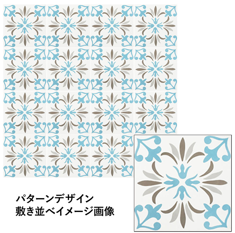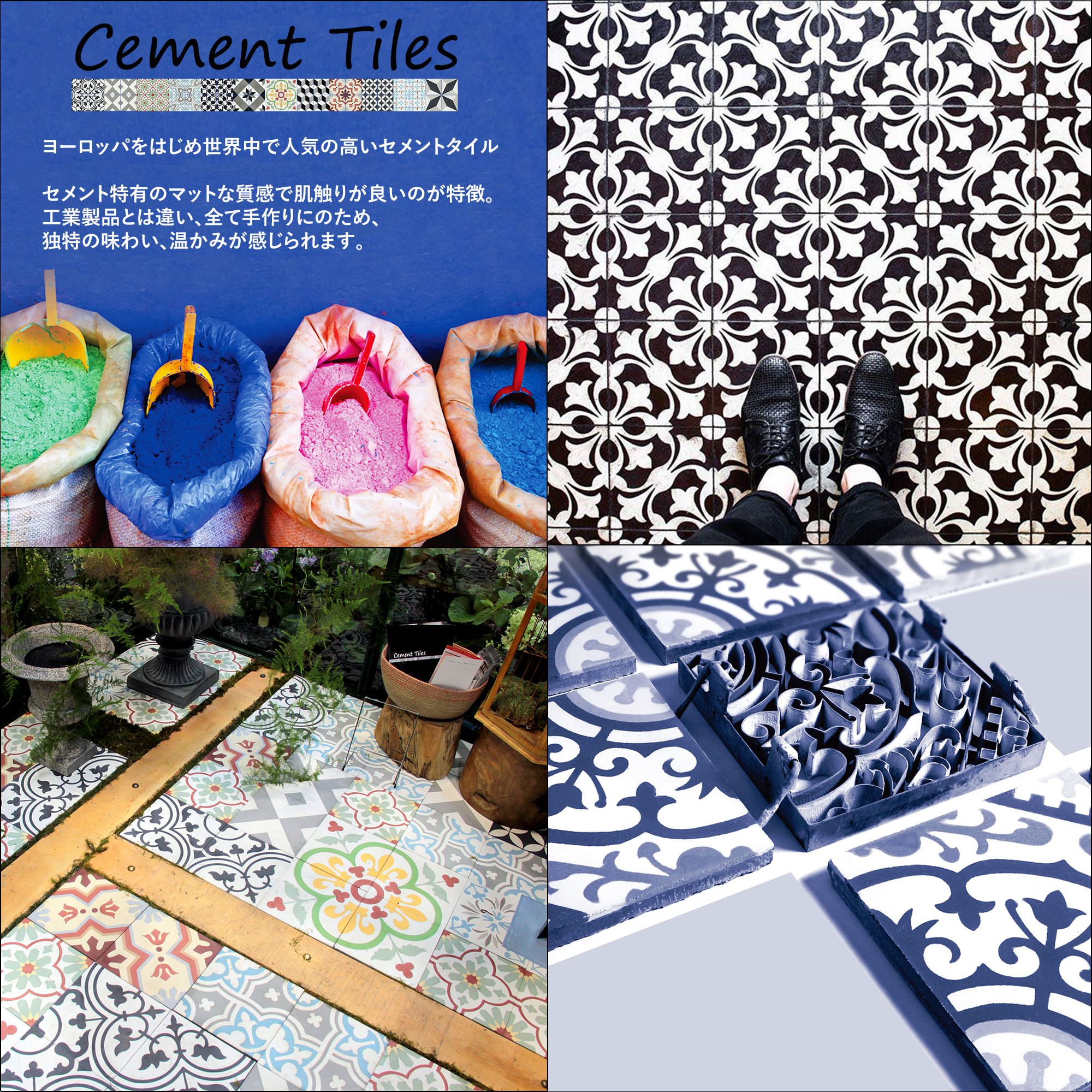 <注意点> 特性について ●セメントタイルは1枚ずつ手作業で作られており、寸法・色調・厚みに若干の誤差があります。 ●表面に小さな欠けや傷、色ムラ、汚れが入ることがありますが、商品の特性としてご理解ください。 ●経年変化により、色の変化、退色、白華現象が発生する場合があります。 ●吸水性が高いため、水濡れの多い場所での使用は推奨されません。 ●土足で使用する場合は、汚れが吸着しやすい点にご注意ください。 施工について ●色ムラなどがあるため、施工の際には、数箱を混ぜ合わせて仮並べするなどして、必ず全体のバランスを見てから貼って下さい。 ●寸法誤差があるため、施工時は10mm程度の目地幅を取ってください。 また厚みにも若干の誤差がある場合があるため、調整しながら施工してください。 ●タイルに養生テープなどを貼り付けないでください。変色や汚れの原因となります。 ●施工、目地詰め時には、ドライアウト防止のためセメントに水分を吸わせて施工してください。 ●色のついた目地材(特に黒系)は表面に色が残りやすいため、できるだけ白の目地材をご使用ください。 取り扱いについて ●セメントタイルは柔らかく、角が欠けやすいため、取り扱いには十分ご注意ください。 ●防水・防汚のためコンクリート(セメント)用の撥水材(水性)を使用すると汚れにくくなります。 ●洗浄の際は、中性洗剤、もしくは水で洗浄してください。 ●酸性洗剤の使用は避けてください。 その他 ●青系の色は紫外線の影響で退色することがあります。 防止策として浸透性保護剤を塗布できますが、完全には防げません。 ●入荷時期により画像とは細部の模様や色が若干異なることがあります。