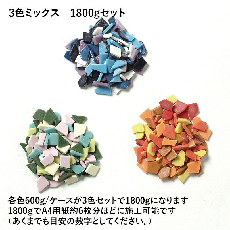 サイズ:ランダムシェープ ミックスカラー 入り数:1800g(600gケースが3セット) 施工可能面積(1800g):A4用紙で約6枚分 (特殊形状のため貼り方により大きく変動しますので、あくまでも目安の数字としてください。) |