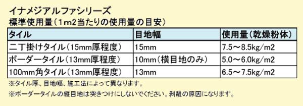7.5〜8.5kg/m2【二丁掛けタイル(15mm厚程度)、目地幅:15mmの場合】 5.0〜6.0kg/m2【ボーダータイル(13mm厚程度)、目地幅:10mm(横目地のみ)の場合】 6.5〜7.5kg/m2【100mm角タイル(13mm厚程度)、目地幅:13mmの場合】 ※使用条件で異なります |