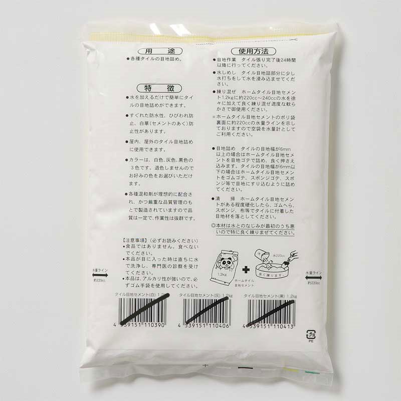 <特徴> ●優れた防水性、ひび割れ防止、白華(セメントのあく)防止性があります。 ●屋内、屋外のタイル目地詰めに使用できます。 ●袋裏面に約220ccの水量ラインを印してありますので、空袋を水量計として使用いただけます。
