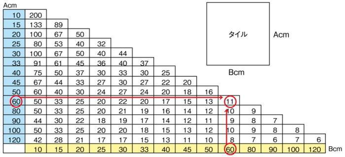 例えば、A=60cm、B=60cm のタイルを施工する場合は、1平方メートルあたりに必要な専用スペーサーは11個になります。