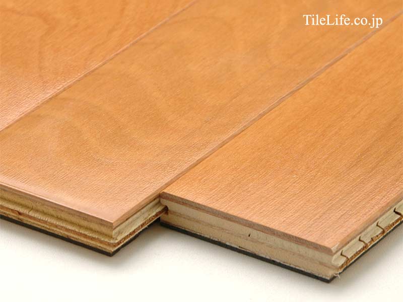 表面材は天然木の厚い単板を使用し、無垢材の質感と複合フローリングの安定した形状を両立したハイグレートな商品です、詳しくは「表面材の厚みによる違い」をご覧下さい。