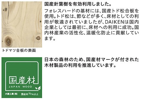 艶やかな表面化粧で傷や汚れにも強く、国産針葉樹を基材に使用した環境にやさしい天然木化粧の床材です。