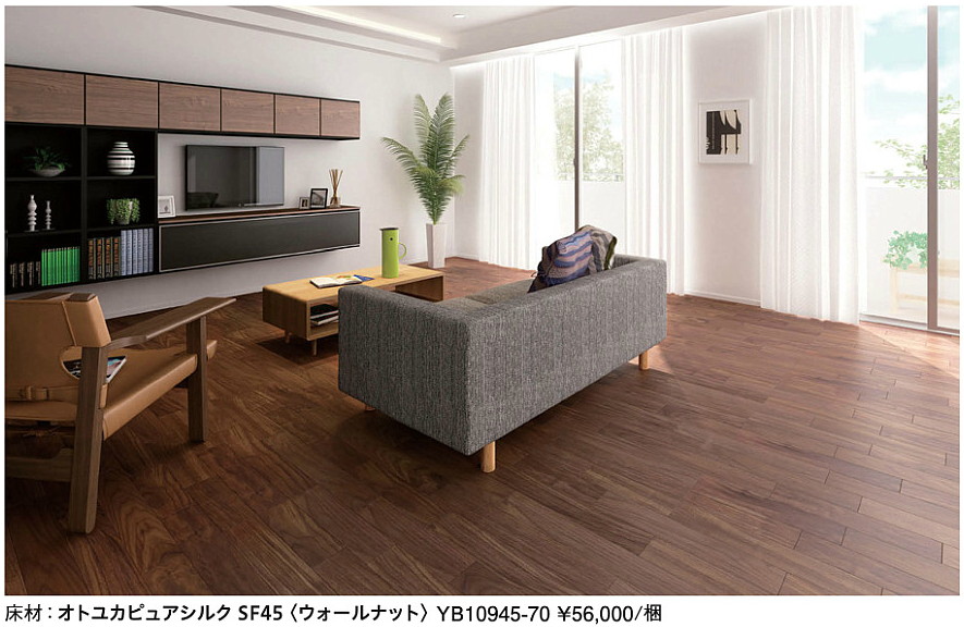 ・商品シリーズ名 : オトユカピュアシルクSF45 ・色名 : ウォールナット ・品番 : YB10945-70 <商品の仕様> ●仕上げ:UV抗菌耐摩耗マットコート仕上げ / WPC加工 ●基材:裏溝加工合板 ●表面材:WPC加工 ●辺や溝加工:四辺本実加工、長辺R面取り、短辺面取り <注意事項> ■使用上のご注意について、詳細はメーカーカタログの「フロアーの使用上のご注意」をご覧ください。 ■キャスターの直接使用は避けてください。 ■車イスにつきましては、繰り返しのご使用や、材質・形状などの条件によっては、表面に傷や汚れがつくことがありますのでご注意ください。 ■車イスは約20kg以下のものをご使用ください。 ■建具などの垂直部材と同一の色柄名、色記号を使用し、それぞれの素材感を生かした色調で、空間コーディネートできるようにしています。ただし、色が若干異なる場合があります。 ■床衝撃音レベル低減量(ΔLL等級)は、一定の条件下での試験場での測定値です。実際の性能は、建物の構造、スラブの種類、梁区画面積、および部屋の平面プラン、階下の吸音性能などにより異なります。 ■老人ホームや公共施設等の床には、コミュニケーションタフなどの土足用直床をご使用ください。 ■床材の特性について、詳細はメーカーカタログの「木質床材の表情について」をご覧ください。 ■天然木の素材を生かした床材ですので、入り皮・スジ・節等、通常の床材よりも多く入ります。 ■エクオスピュアシルクとは基材が異なるため、凹み傷のつき難さについては差があります。 ■ワックスは必要ありません。お客様のご都合によりワックス掛けされる場合は、DKワックスネオ(→P.118)をご使用ください。艶の低いワックスをお求めの場合は、DKワックスネオ艶消しタイプをDAIKENパーツショップよりお買い求めください。他のワックスは塗りムラ等の原因となります。 ■施工前に仮並べし、全体のバランスを見ながら割り付けて施工してください(設計・施工資料P.7をご覧ください)。 ■開梱時は梱包ケースの木口から引き抜かないでください。フロアー表面を傷める可能性があります。 ※数量が多い場合は分納になる場合がございます。