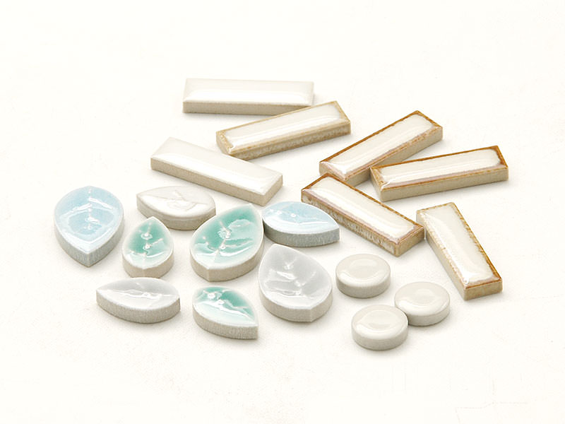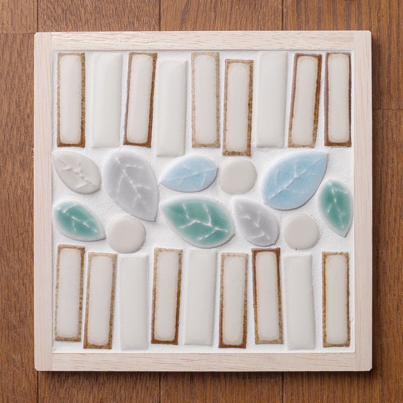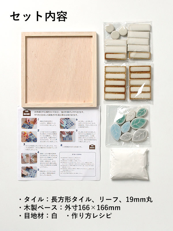 <タイル> 長方形:15mm×47.5mm、厚み6mm 19mm丸:19mm丸、厚み6mm リーフ:(中)約40mm×25mm、厚み7mm、(小)約30mm×18mm、厚み7mm <木製ベース> 外寸166mm×166mm、内寸148mm×148mm、深さ6mm |