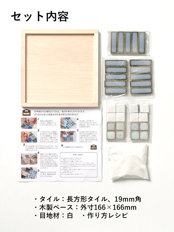 <タイル> 19mm角:19.5mm×19.5mm、厚み7mm 長方形:15mm×47.5mm、厚み6mm <木製ベース> 外寸166mm×166mm、内寸148mm×148mm、深さ6mm |