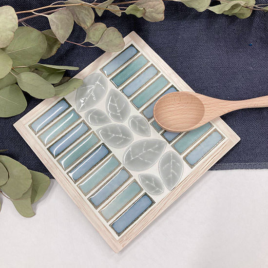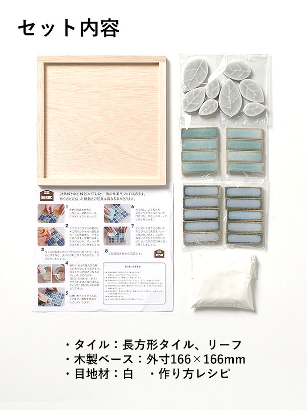 <詳細> ●セット内容:美濃焼タイル(見本写真と同じ)、目地材100g、木製ベース1枚、作り方レシピ ※見本写真と同じ鍋敷きを1枚作ることができるキットです。 (自由にデザインをアレンジすることもできます。) ●ご用意いただくもの:木工用ボンド、スポンジ(目地材拭き取り用)、布(仕上げ用)、ピンセット、小さな容器(目地材を混ぜるため)、目地詰め用ヘラ(段ボールでも可) <注意点> ●多少の寸法誤差があります。 ●ご使用のモニターによって色が実物と異なって見える場合があります。 ●目地材が付いたヘラやスポンジは、キッチンや洗面などでは洗わないでください。配管が詰まる可能性があります。 ●熱い鍋を置いてもタイルは変質しませんが、木枠は焦げて変色する事があります。 ●タイル誤飲防止の為、小さなお子様が作られる際は、必ず大人の方が付き添いをお願いいたします。
