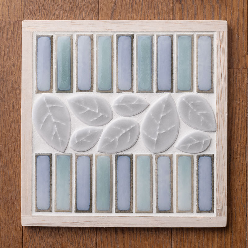 <タイル> リーフ(大)50mm×30mm、厚み7mm、(中)40mm×25mm 厚み7mm、(小)30mm×18mm 厚み7mm 長方形:15mm×47.5mm、厚み6mm <木製ベース> 外寸166mm×166mm、内寸148mm×148mm、深さ6mm |