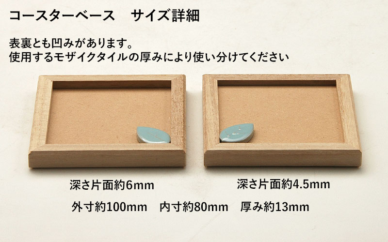 <タイル> ハート:23mm×23mm、厚み4mm クローバー:13mm×13mm、厚み4mm 10mm丸:10mm丸、厚み4mm 10mm角:10mm×10mm、厚み4mm <木製ベース> 外寸約100mm 内寸約80mm 厚み約13mm 深さ片面約4.5mm 片面約6mm |