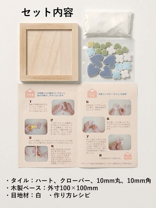<詳細> ●セット内容:美濃焼タイル(見本写真と同じ)、目地材30g、木製ベース1枚、作り方レシピ ※見本写真と同じコースターを1枚作ることができます。 ●ご用意いただくもの:木工用ボンド、スポンジ(目地材拭き取り用)、布(仕上げ用)、ピンセット、小さな容器(目地材を混ぜるため)、目地詰め用ヘラ(段ボールでも可) <注意点> ●多少の寸法誤差があります。 ●ご使用のモニターによって色が実物と異なって見える場合があります。 ●目地材が付いたヘラやスポンジは、キッチンや洗面などでは洗わないでください。配管が詰まる可能性があります。 ●熱い鍋を置いてもタイルは変質しませんが、木枠は焦げて変色する事があります。 ●タイル誤飲防止の為、小さなお子様が作られる際は、必ず大人の方が付き添いをお願いいたします。 ●木製ベースは製造時期によって多少寸法誤差が生じます。