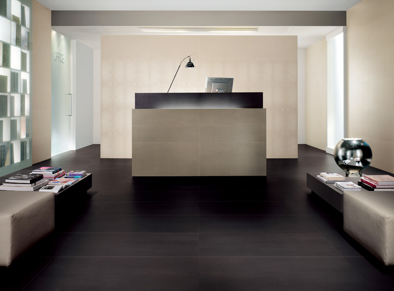 玄関床面に鏡面タイル、洗面所床にアイボリーの