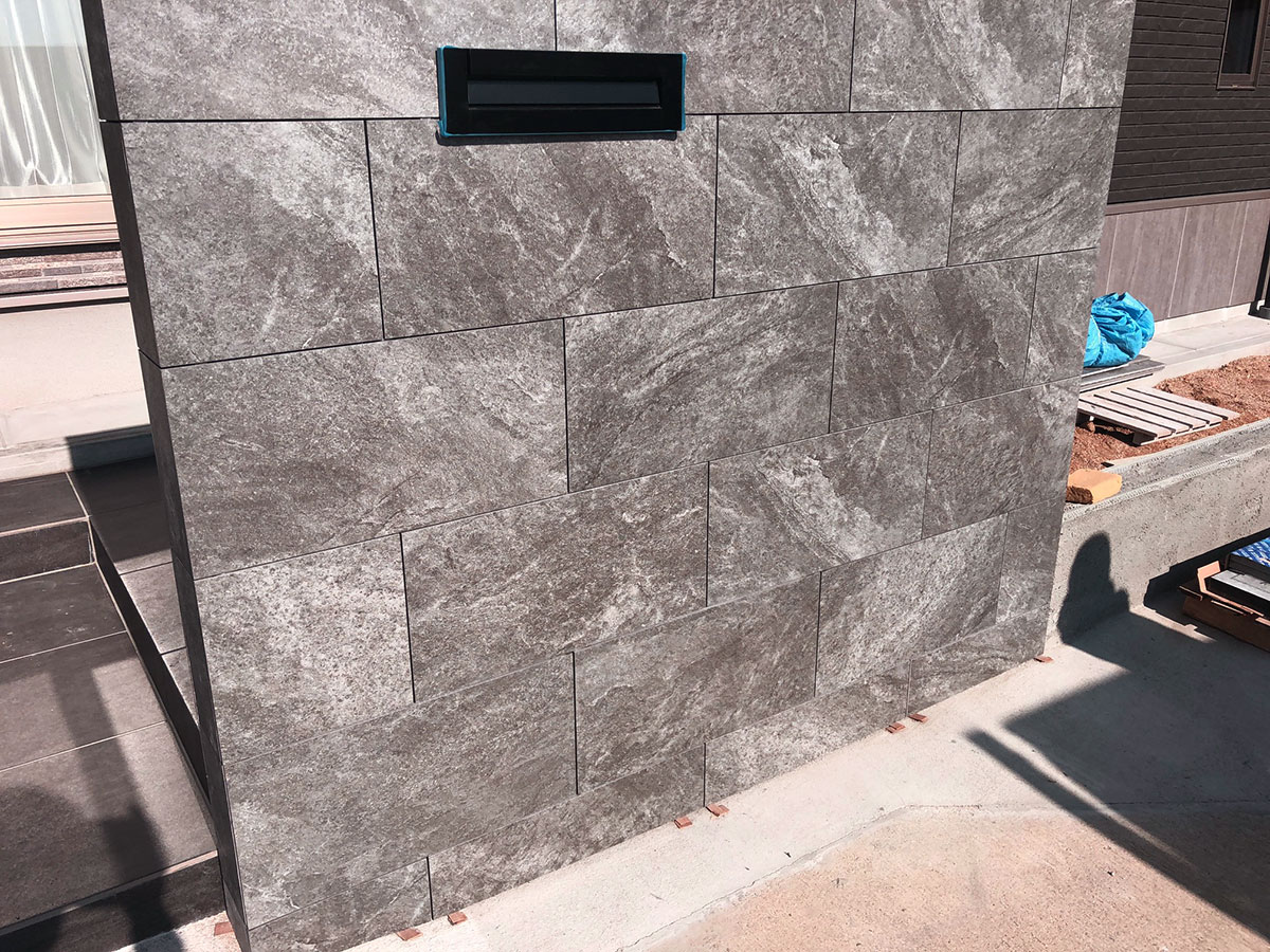 天然石のクォ―ツサイトをイメージしたタイルです。 割肌調の表面の風合いと大胆な柄が高級感を醸し出します。