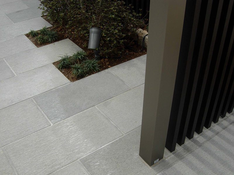 ライトグレーの落ち着いた雰囲気に仕上がる玄武岩(バサルト)の歯ビシャン仕上げです。