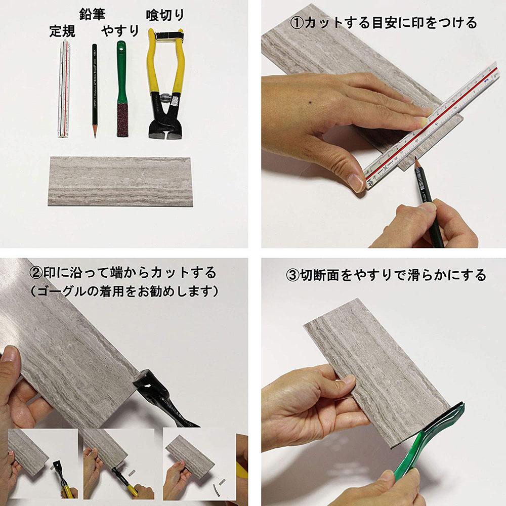 ●カットには喰い切りを使用して少しずつカットし切断面をやすり等で整え、端部はコーキングや見切り材を使用して納めてください。