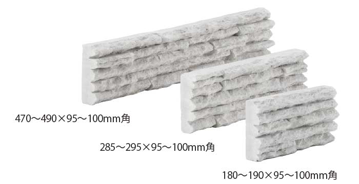 力強く、こだわりの面状が生み出す壁面は圧倒的な重厚感と個性を創造します。 <注意点> ●特徴ある意匠をつくるため、寸法・形状に大きなバラツキをもたせてあります。 ●大きな色幅が特徴の製品です。 ご採用にあたってはサンプルをご確認ください。 ●平物は大、中、小3種類のサイズが1:1:1の比率で梱包しています。 ●ご注文はケース単位にて承ります。 ●接着剤張り工法専用製品です。 ●塗り目地施工はできません。 ●施工前に仮置きをし、全体のバランスをおとりください。 ●セメント成型品のため、成型時の収縮による誤差があります。 ●形状に多少の寸法誤差があるため、施工の際に最低2mm程度の目地をおとりください。 ●セメント製品の特質上、年数を経て色が変化することがあります。 この特徴を十分にご理解の上ご採用願います。 ●接着剤張工法専用のためモルタル施工はできません。