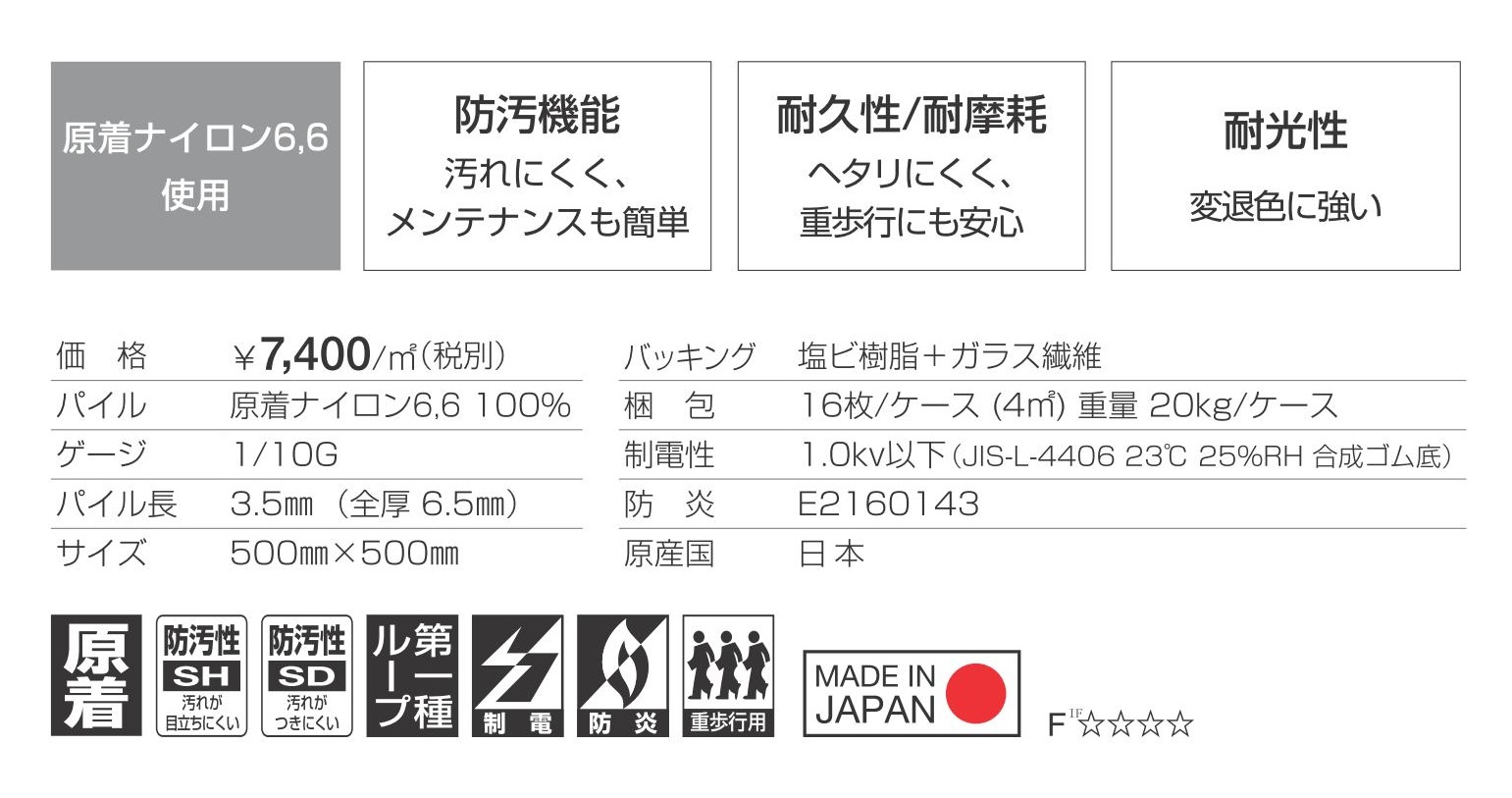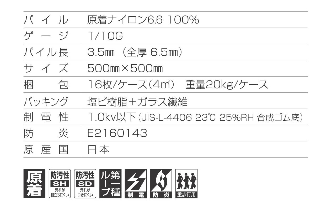 <原着ナイロン6,6の特長 > 1-防汚性 メンテナンス性(汚れにくく、メンテナンス簡単) 原着ナイロンは優れた防汚機能をもっており、汚れがつきにくいだけでなく、簡単に取れる構造になっています。 繊維の中に顔料が練り込まれているため、業務用クリーニングによる色褪せを起こしにくいです。 2-耐久性(ヘタリにくく、長持ち) 他の繊維よりも弾性回復力に優れ、ヘタリに強いので、重量物によるへこみ跡が出来ても、時間が経てば元に戻ります。 また、キャスター移動などの摩擦に強く、パイルの色落ちや消失が少ないです。 3-耐光性(紫外線で変色しにくい) 直射日光に対しての色褪せに強く、カーペットの美観を長く保ちます。
