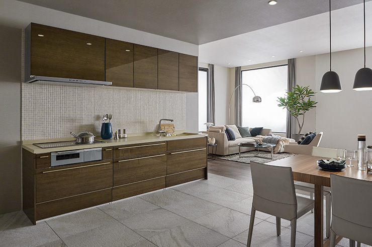 窯変調のマット釉とブライト釉がミックスされた焼き物の風合いが上品な空間を演出します。