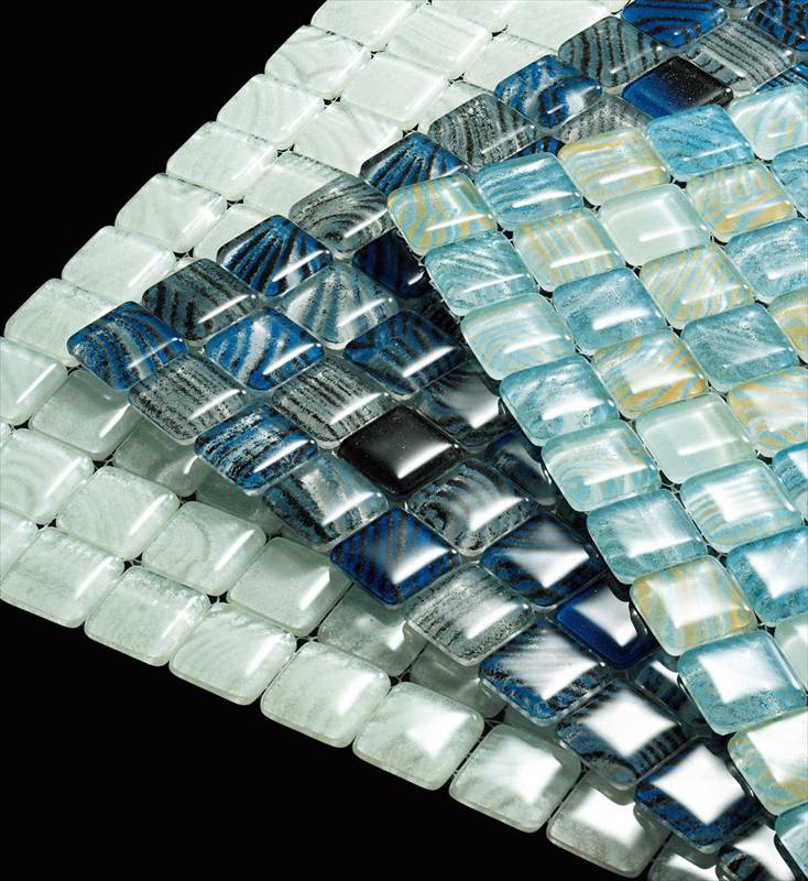 さまざまな柄と色合いが混ざり合った表情で、深み感や透明感のあるガラスモザイクです。