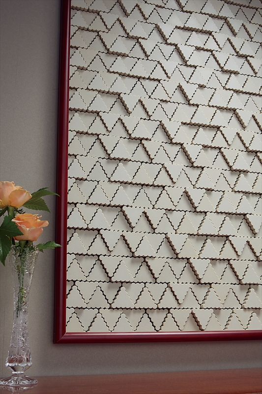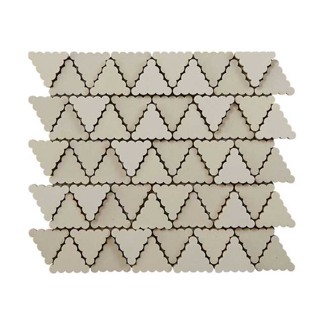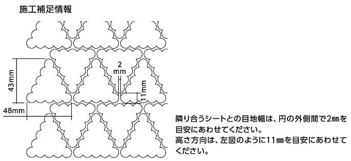 丸と三角の組合せでできた複雑な形状が特徴的なタイルです。 商品の留意点 ●接着剤張り専用商品です。 ●目地詰めはできません。 ●キッチンバック等では使用できません。 ●細目地の間から連結材が見えます。タイルの連結材の色はグレーにしていますので、接着剤はG3色をご使用ください。 ●シートの設定目地幅は2.0mmですが、タイル寸法公差・形状特性によるバラツキがあります。 ●シートには方向性があります、左上のピースが14.0mm厚がくるのが正体です。 ●切断せず納まるように割り付けてください。やむを得ず切断する場合は、切断端部が鋭利になり危険ですので、切断面を市販の見切り材でカバーするなど、必ず安全面のご配慮をお願いします。 ●細目地の間から接着剤のクシ目が見えることがあります。 ●標準価格およびあたり枚数にロスは含まれていません。 施工上のご注意 ●切断する場合は、切断部が動かないように養生テープ等で固定後、電動丸ノコを用いて切断してください。