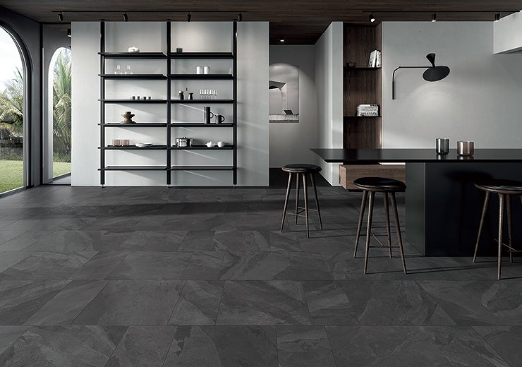 黒の石目が特長のブラジリアンスレートをモチーフにしたタイルです。内外空間にご使用いただけます。