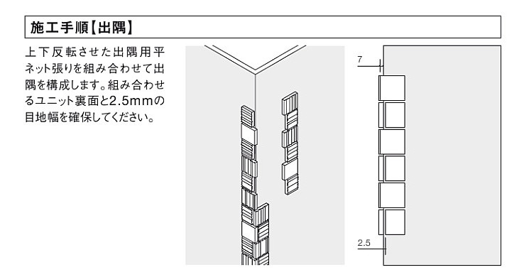 和の要素を感じる土の質感とシンプルな形状が、和モダン住宅の全面タイル張りにお薦めです。 商品の留意点 ●接着剤張り専用商品です。 ●細目地の間から連結材が見えます。 タイルの連結材の色はグレーにしていますので、接着剤はG3色をご使用ください。 ●細目地の間から接着剤のクシ目が見えることがあります。 ●ユニット品の設定目地幅は縦・横とも2.5mmですが、タイル寸法公差等によるバラツキがあります。 ●セラヴィオW・Sとはユニット寸法が異なります。 張り合わせる場合は見切り材等をご使用ください。 ●90°屏風曲ネット張り(接着)はフラット面状となっています。 ●標準価格およびあたり枚数にロスは含まれていません。 ●キッチンバック等では使用できません。 施工上のご注意 ●仕上がりが下地精度の影響を受けやすいため、下地調整を行ってください。 ●接着剤は「はるかべ工法専用接着剤」をご使用ください。 ●モルタル施工はしないでください。 裏あし形状はあり状ではないので、剥離の原因となることがあります。 ●突きつけ目地施工はしないでください。 剥離や欠けの原因になります。 ●漏水等のトラブルを防ぐために、下地側での防水処理(防水紙・防水テープの取付け)を必ず行ってください。 ●タイルの縁や角に尖った部分があるため、強くぶつかるとけがをする可能性があります。
