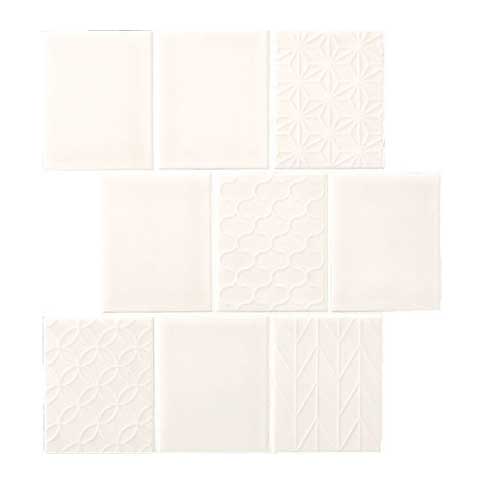 透明感のある釉薬のゆらぎの中に和の古典柄をモダンにアレンジ。レトロな雰囲気が映えるデザインタイルです。 商品の留意点 ●100×80mm角セット(レリーフ)は1ケースの中に4種類の柄が1枚づつ同梱されています。特定の柄を指定しての発注およびバラ出荷はできませんので、ご了承ください。 ●色番によって色幅の大きさが異なります。 ●100×80mm角平(フラット)もネット張り品同様の色幅があります。 ●100×80mm角ネット張りA(馬踏目地)と100×80mm角ネット張りB(馬踏目地)は、混ぜて張ることをお薦めします。 施工上のご注意 ●100×80mm角ネット張りA・B(馬踏目地)は、推奨施工パターン図を参照の上、施工してください。