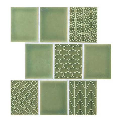 透明感のある釉薬のゆらぎの中に和の古典柄をモダンにアレンジ。レトロな雰囲気が映えるデザインタイルです。 商品の留意点 ●100×80mm角セット(レリーフ)は1ケースの中に4種類の柄が1枚づつ同梱されています。特定の柄を指定しての発注およびバラ出荷はできませんので、ご了承ください。 ●色番によって色幅の大きさが異なります。 ●100×80mm角平(フラット)もネット張り品同様の色幅があります。 ●100×80mm角ネット張りA(馬踏目地)と100×80mm角ネット張りB(馬踏目地)は、混ぜて張ることをお薦めします。 施工上のご注意 ●100×80mm角ネット張りA・B(馬踏目地)は、推奨施工パターン図を参照の上、施工してください。